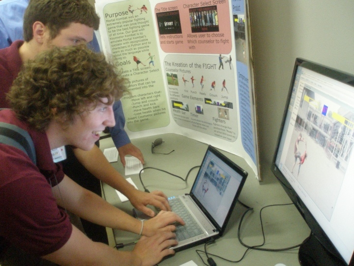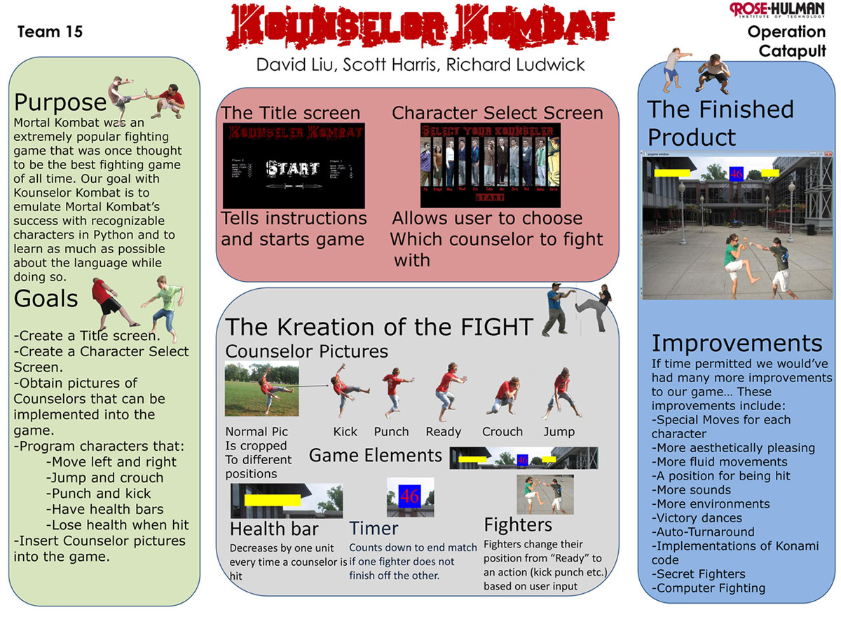 After a discussion, we came up with an idea that put our counselors into the game and made them fight with each other. To achieve this, we need to take a lot of pictures of the counselors and cropped to different positions. We used Pygame module to handle picture, animation, sound and key events. We made a poster and gave elevator speech to professors and other students.